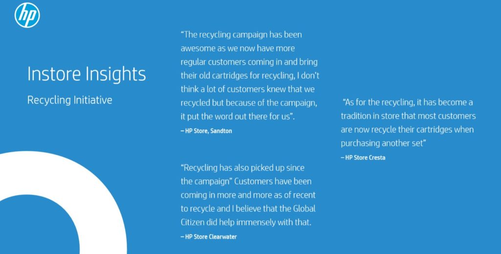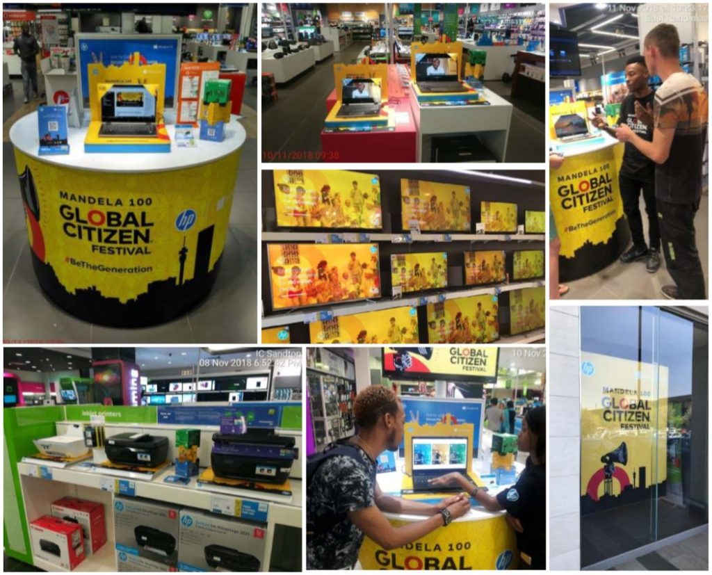 In Q4 we ran a Global Citizen awareness campaign in all seven HP stores across the country, as well as in the top 20 Incredible Connection stores.